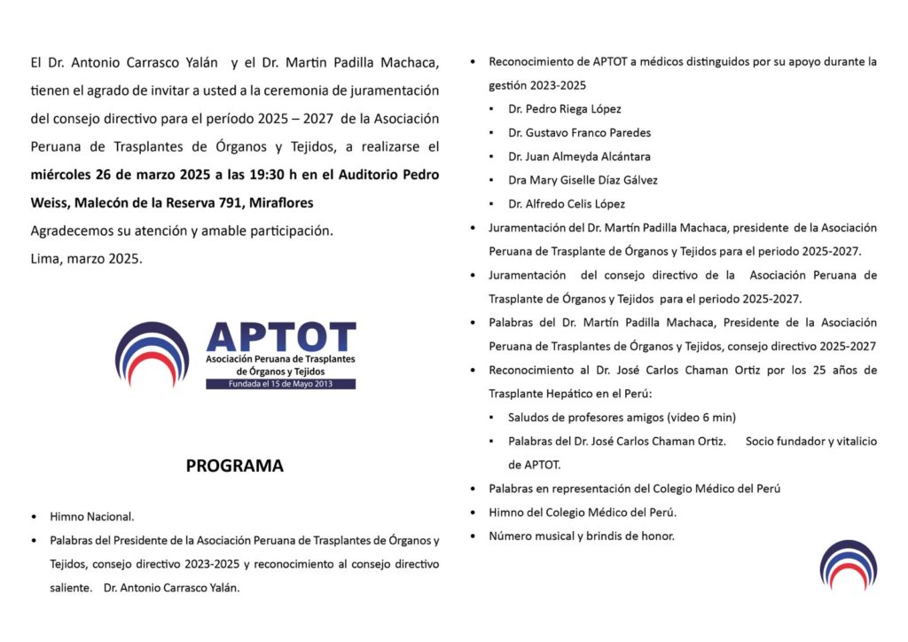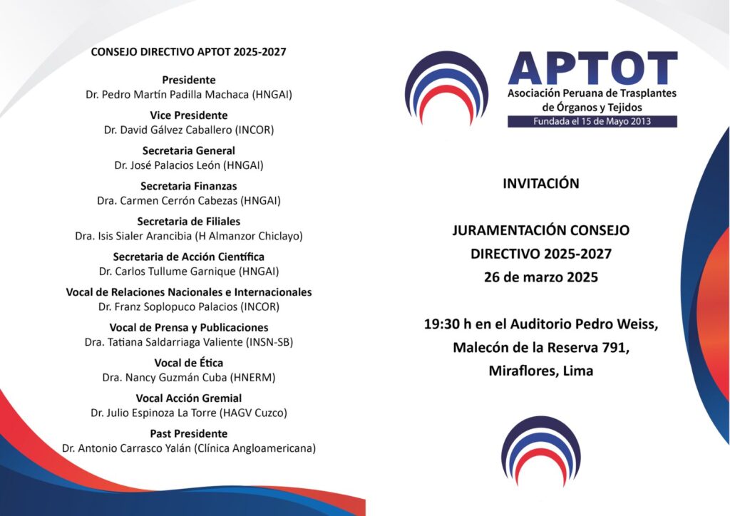 Lima, marzo de 2025 – La Asociación Peruana de Trasplantes de Órganos y Tejidos (APTOT) se alista para realizar la ceremonia de juramentación de su nuevo Consejo Directivo para el período 2025–2027. El evento se llevará a cabo este miércoles 26 de marzo a las 19:30 h, en el Auditorio Pedro Weiss, ubicado en el Malecón de la Reserva 791, Miraflores.
